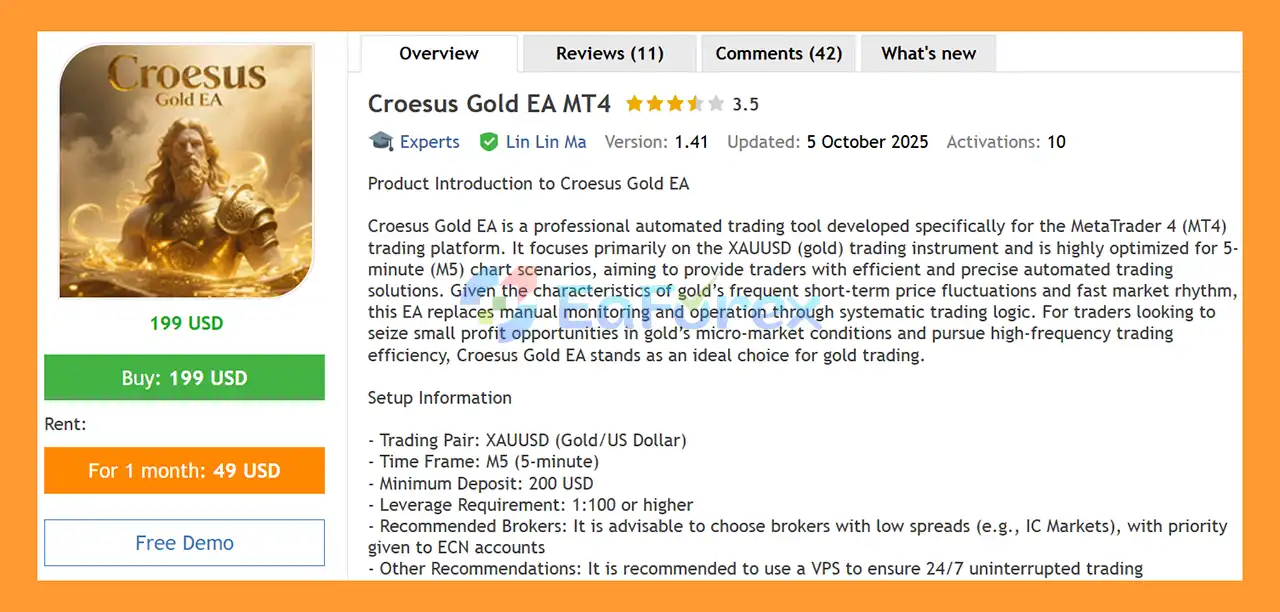 In summary, Croesus Gold EA MT4 is a specialized and professional automated trading solution built exclusively for XAUUSD trading on the MT4 platform. Optimized for the M5 timeframe, it takes advantage of gold’s short-term volatility through a precise, high-frequency trading approach without overfitting or risky gimmicks. With verified Myfxbook performance, controlled drawdowns, full automation, and a broker-friendly ECN design, Croesus Gold EA MT4 is an excellent choice for traders seeking a reliable, disciplined, and gold-focused Expert Advisor capable of delivering consistent results with moderate starting capital.