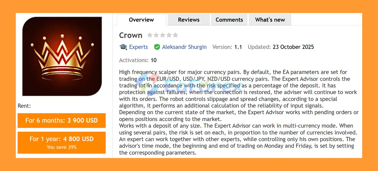 In summary, Crown EA MT4 is a powerful high-frequency scalping robot built for traders seeking fast execution, dynamic risk control, and fully automated performance on major forex pairs. With its adaptive trading logic, multi-currency support, spread protection, and robust recovery features, it offers a secure and efficient solution for MT4 users who want consistent automated trading results. Fully customizable and reliable, Crown EA MT4 is an excellent choice for both novice and professional traders looking to optimize their scalping strategy.