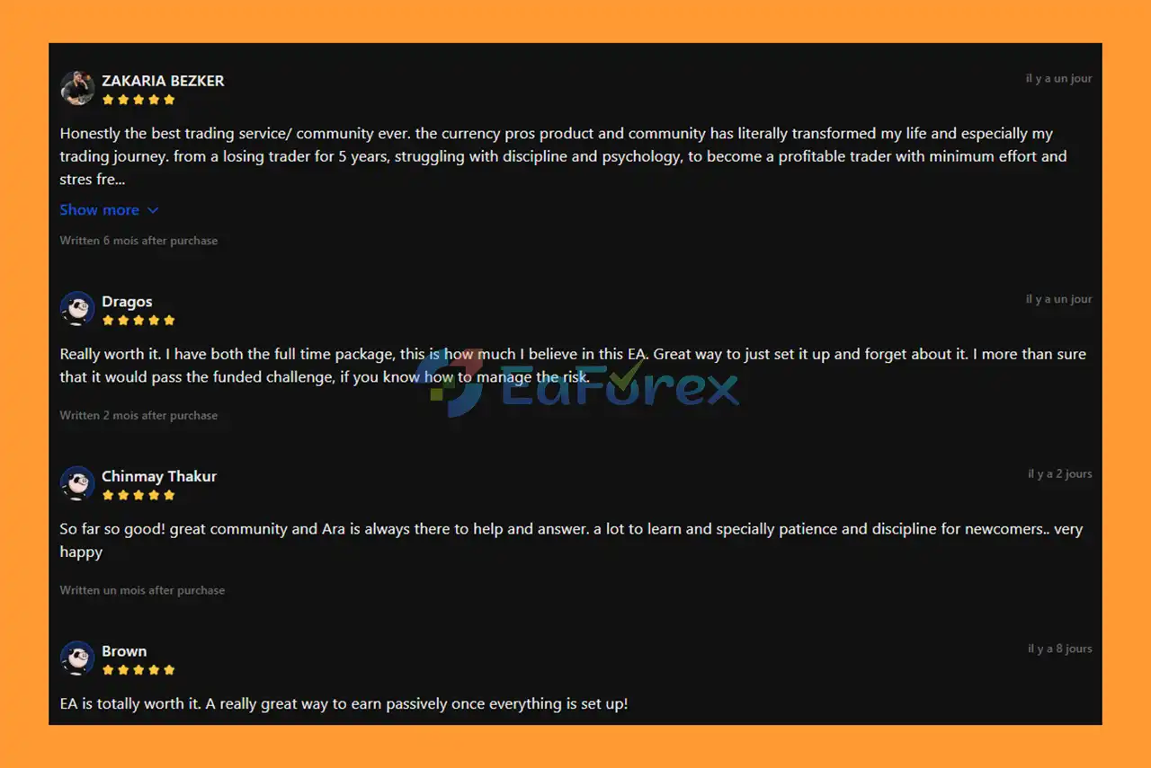 🔺Currency Pros Breakout EA is highly appreciated by the MQL5 community for bringing stable and reliable profits. Below are 5 star reviews from users: