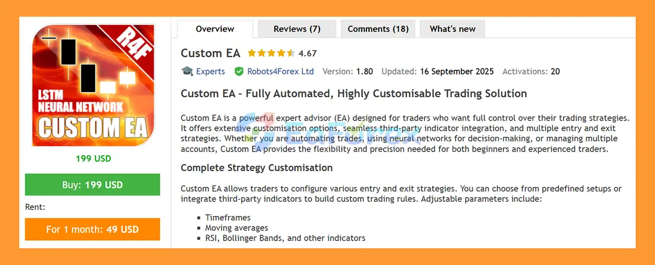 Custom EA MT4 is a fully automated and customizable Expert Advisor for MetaTrader 4. It allows traders to design and automate their own trading strategies using built-in technical indicators, third-party tools, and AI-powered LSTM neural network technology. The EA analyzes market conditions, generates trade signals, and executes trades automatically based on user-defined rules.