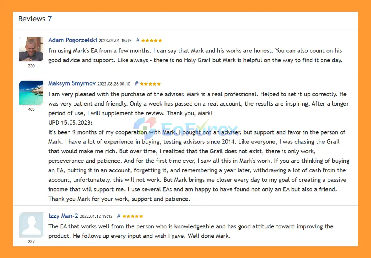 🔺 Custom EA is highly appreciated by the MQL5 community for bringing stable and reliable profits. Below are 5 star reviews from users:
