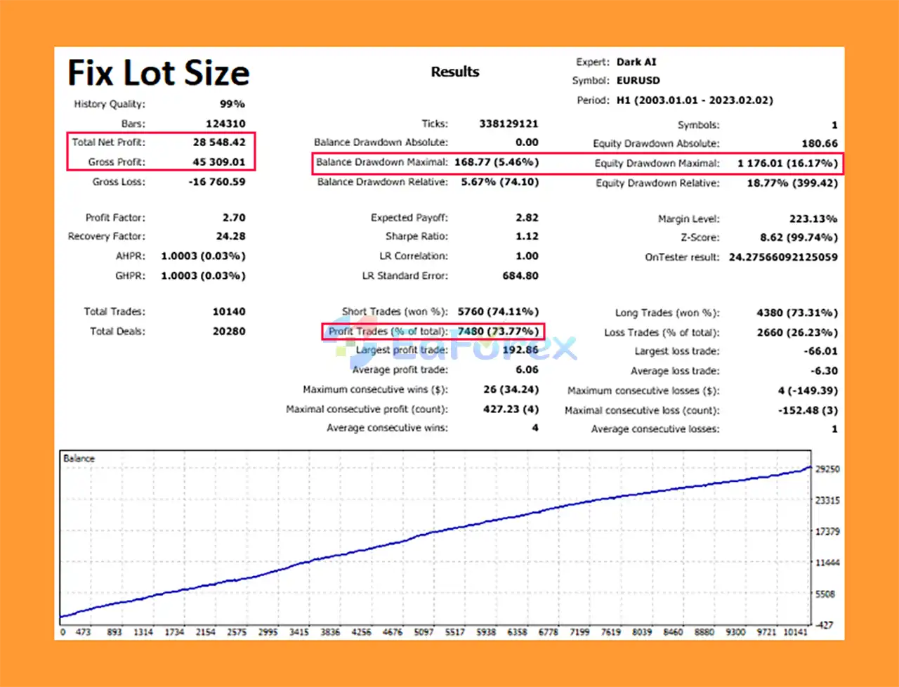 Fixed Lot: $28,548 profit | Win rate 73.7% | Max DD: 5.46%