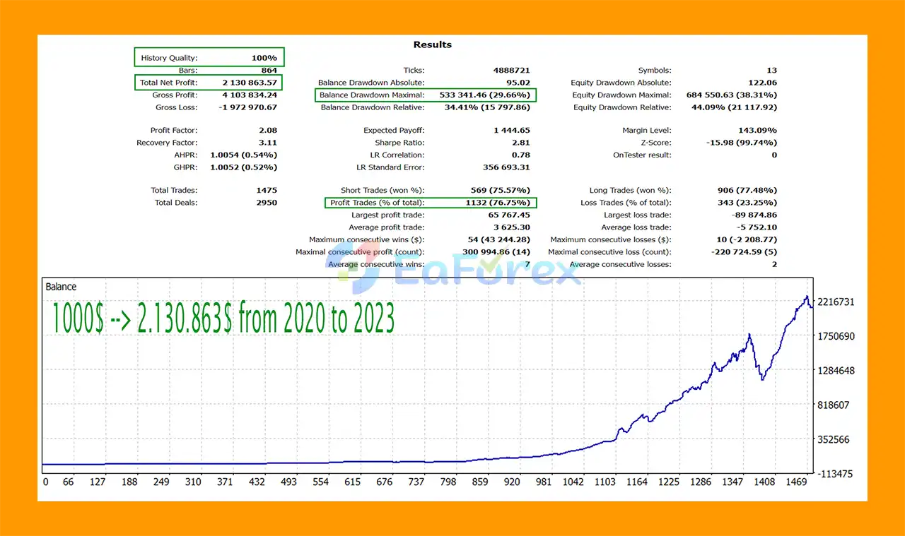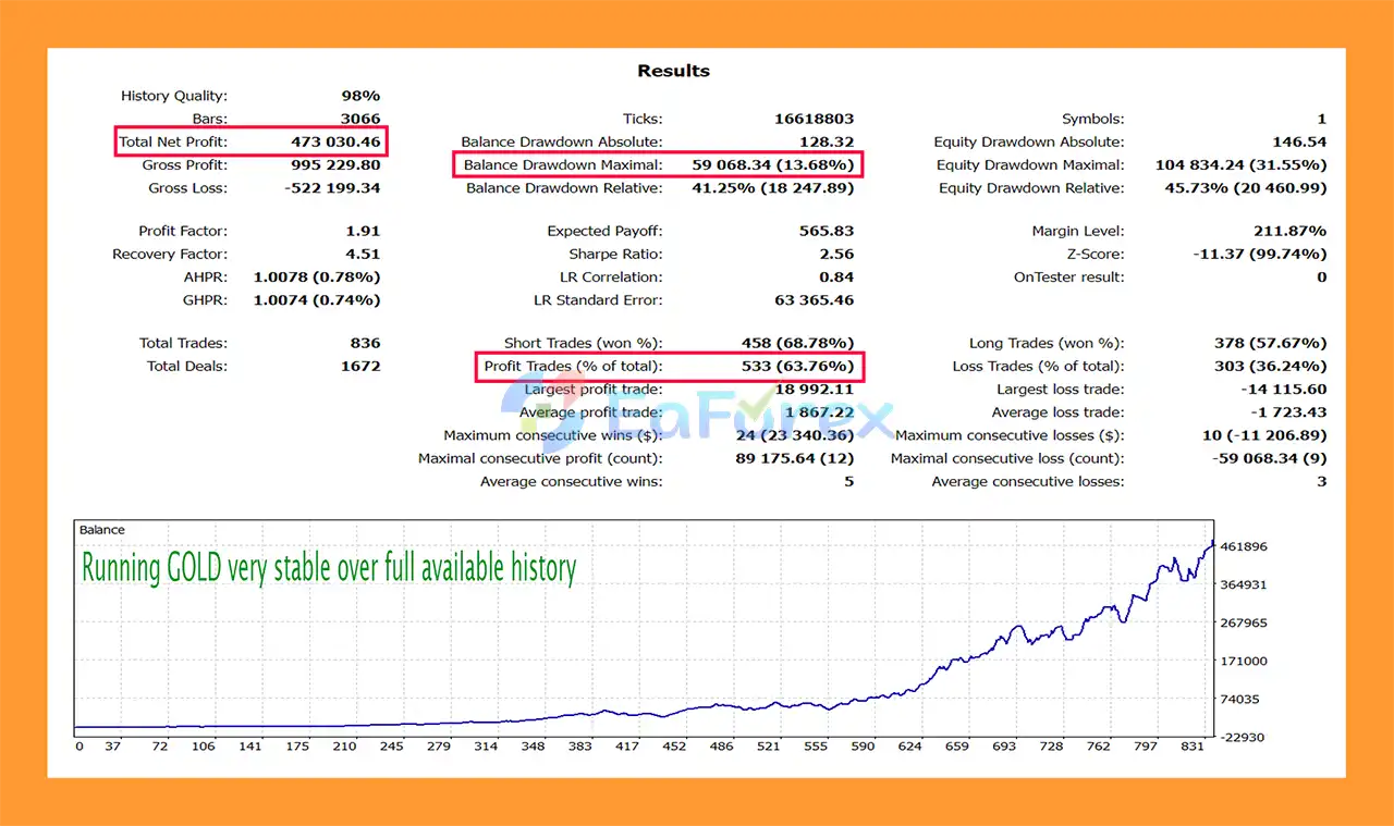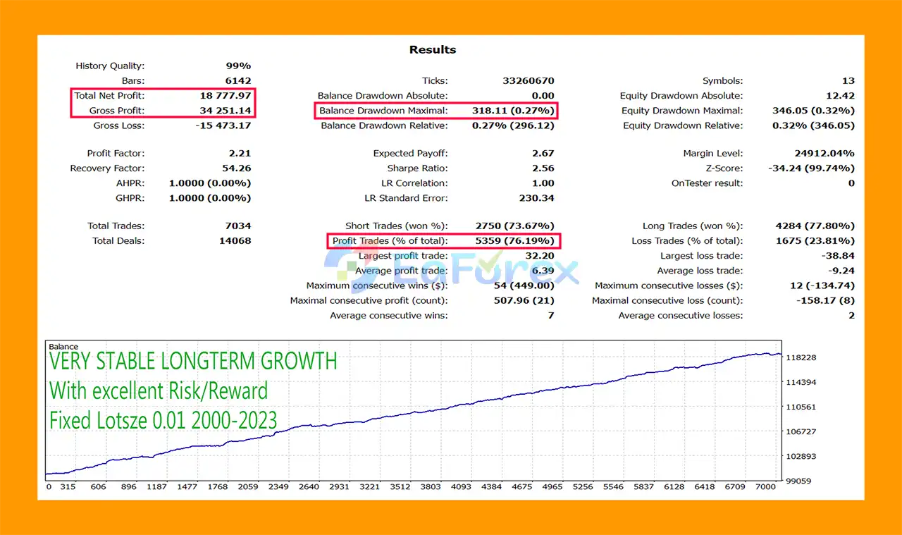 Backtests over 23 years show consistent profitability with a 76% win rate and minimal drawdown. Live accounts have also proven steady growth, with a 72% win rate and controlled drawdowns under 16%.
