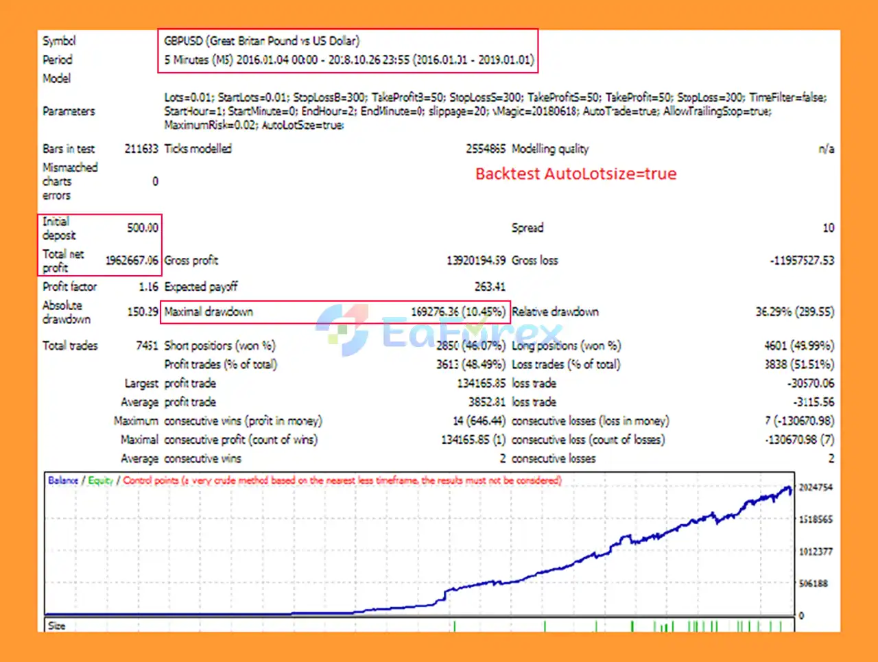 Backtests on GBPUSD show strong results: an initial deposit of $500 grew to $1.96 million over 3 years with a maximum drawdown of 10.45%, demonstrating high profitability and effective risk control.