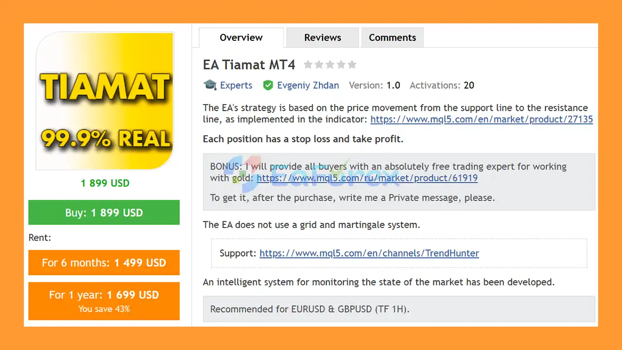 In summary, EA Tiamat MT4 is a powerful and secure Expert Advisor built for traders seeking stable, automated profits on EURUSD and GBPUSD. With its smart recovery system, advanced risk control, and reliable market analysis, Tiamat stands out as a dependable tool for both novice and experienced traders. If you’re looking for an EA that combines safety, intelligence, and proven long-term results, EA Tiamat MT4 is your perfect trading partner.