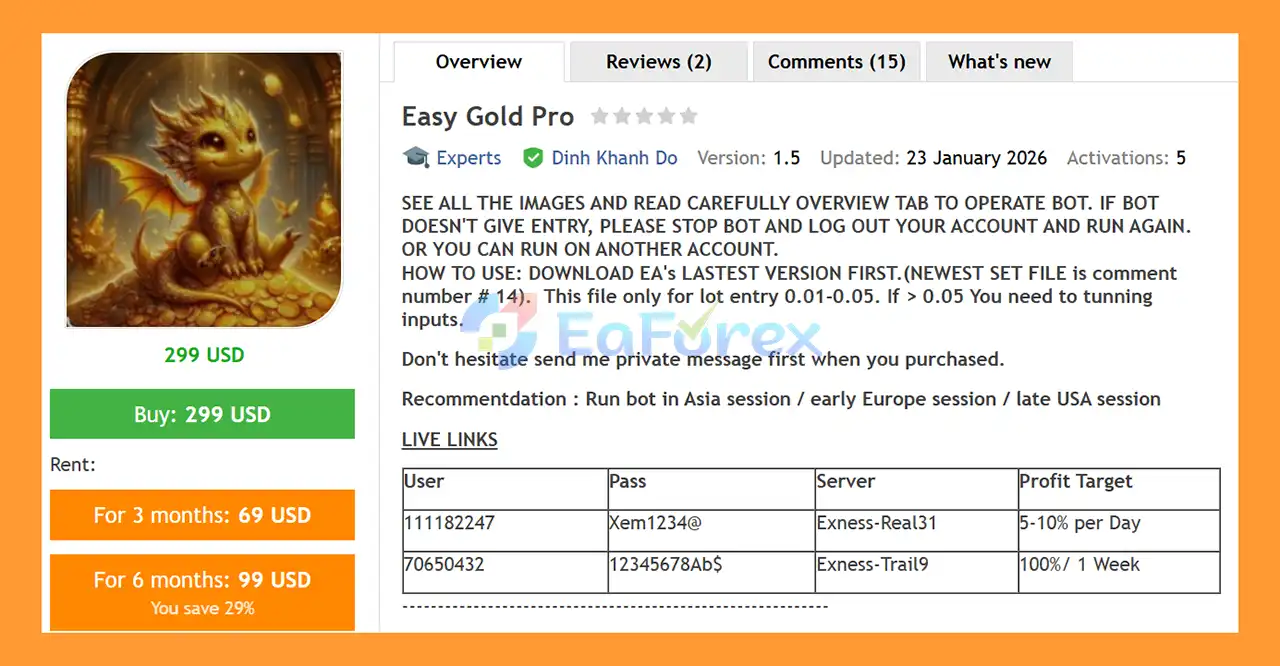 • Notable Products: Easy Gold Pro MT4, Easy Gold Pro MT5, Gold easy MT4 and other advisors.