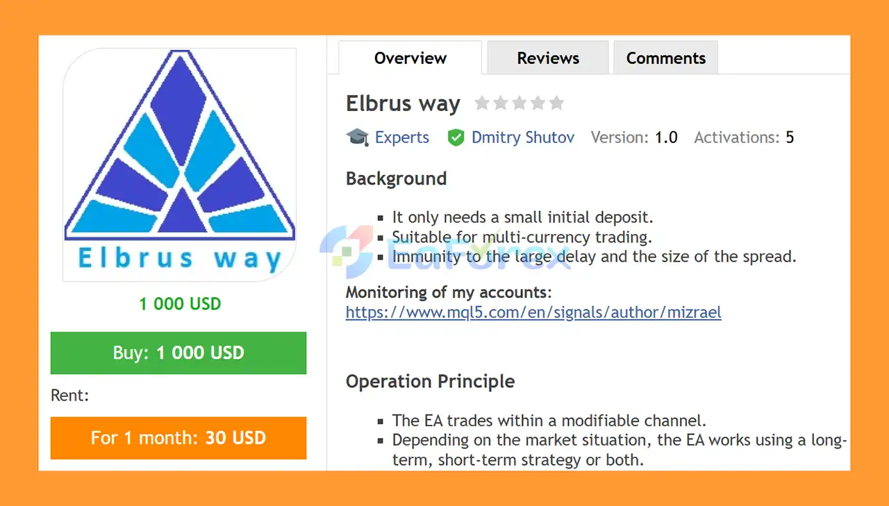 Elbrus Way EA MT4 was developed by Dmitry Shutov, a veteran MQL5 developer with over 10 years of experience. He is also the author of notable EAs like Kryptonite MT4, Vulkan MT4, Take Profit MT4, Sur Ron MT4, and Minotaur MT4.