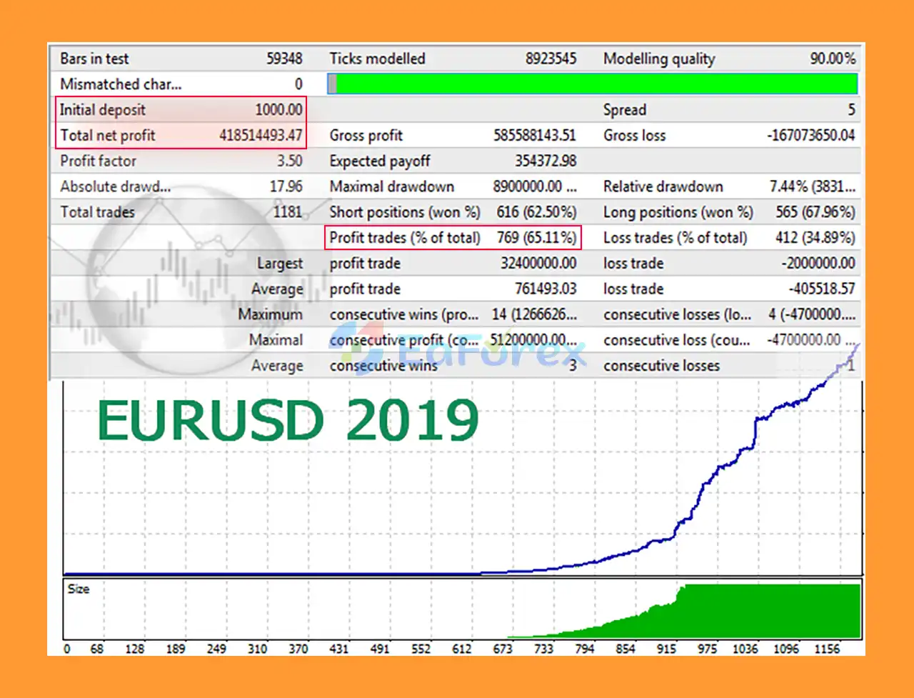 EUR/USD: $418.51 million net profit, 65.11% win rate, 7.44% max drawdown