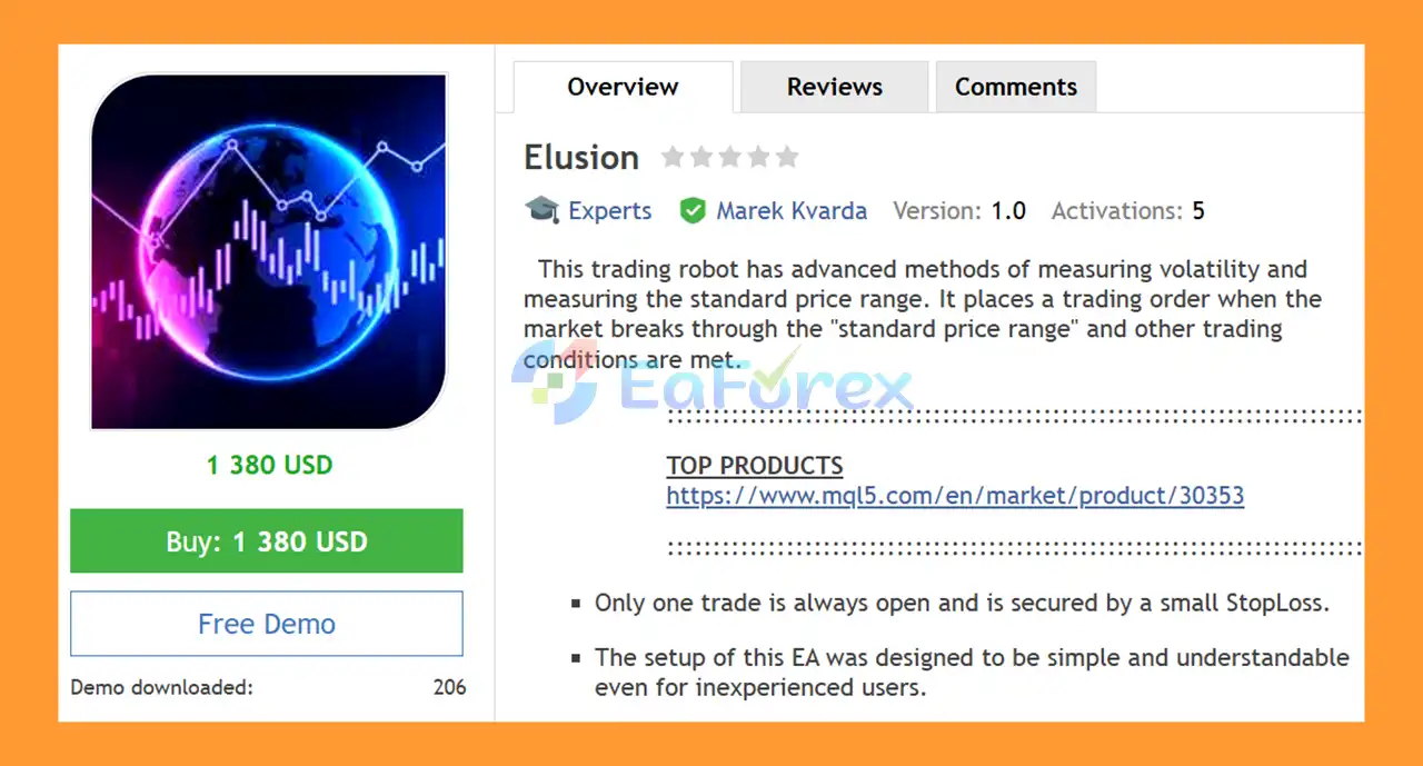 Elusion EA MT4 is a Forex breakout robot for EUR/USD & GBP/USD, using volatility analysis, single-trade management, StopLoss protection & precise execution.