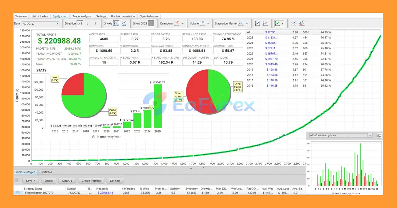 The EA is optimized by default for AUDCAD on the M15 timeframe, offering stable and accurate performance. It also includes a 1OHLC mode for lightweight backtesting on low-performance computers.