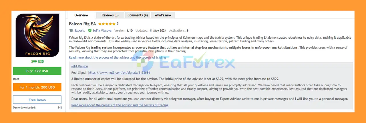 • Notable Products: Falcon Rig EA MT5, Fenghuang Rig EA MT5, Phoenix Rig EA MT5 and other advisors