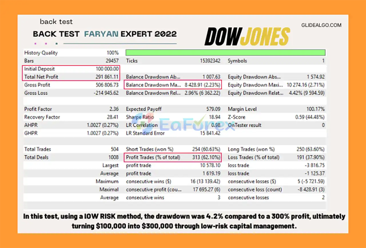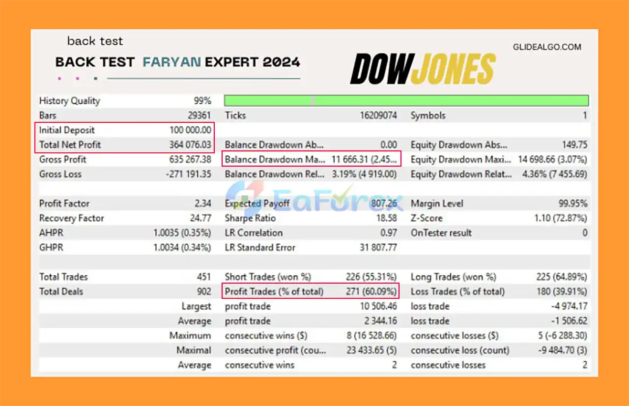 Faryan Ai Trade EA MT5 is optimized specifically for US30 (Dow Jones) trading. Its algorithms are fine-tuned to the volatility, structure, and behavior of the Dow Jones index for maximum accuracy and consistency.