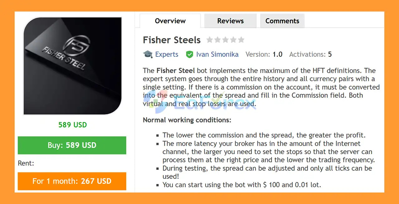 Fisher Steels EA MT4 is a high-frequency trading (HFT) Forex robot designed for the MetaTrader 4 platform. It uses advanced algorithmic logic and volatility analysis to execute rapid automated trades while applying spread filtering and risk management controls.
