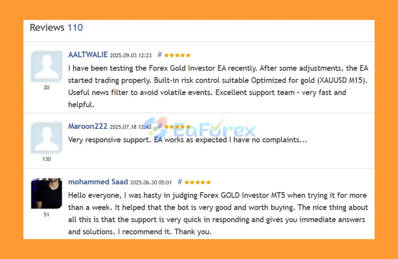 🔺Forex GOLD Investor MT5 is highly appreciated by the MQL5 community for bringing stable and reliable profits. Below are 5 star reviews from users: