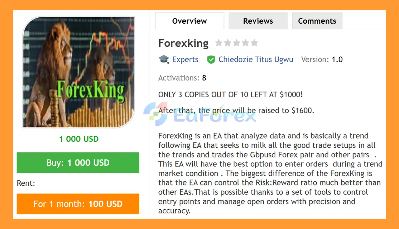 • Notable Products: Forexking EA MT4, Forex Vampire EA MT4, Ethereum Finisher EA MT4, RippleBullRunWizard EA MT4, GoldScalper EA MT4, IndexPro EA MT4, ForexMagician EA MT4 and other advisors.