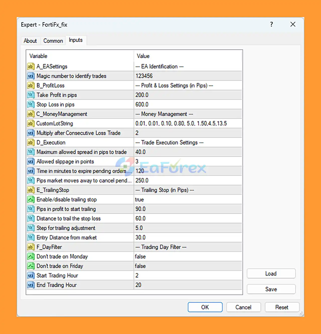 🔺FortiFx EA is an automated Forex trading system designed to trade with pending orders, fixed take-profit and stop-loss points, along with an advanced capital management system. The EA focuses on risk control, spread filtering, stop-loss tracking logic, and time-based trading filters, making it suitable for traders who prefer structured and rule-based automation. Below is a guide on how to use the provided settings.