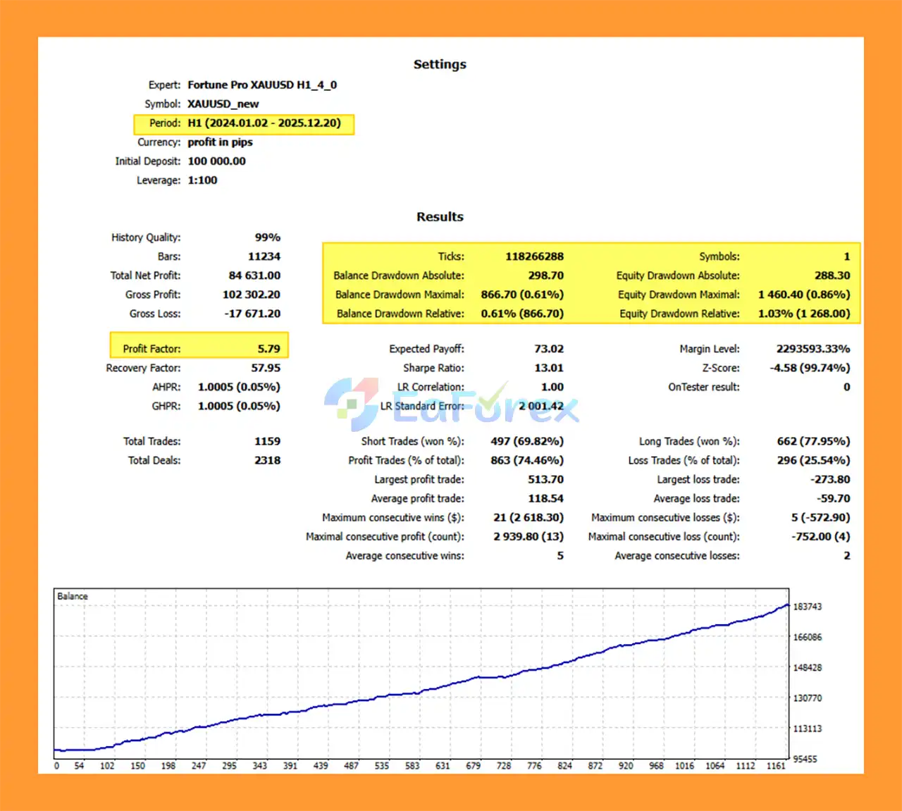 In a 12-month backtest with an initial deposit of $100,000, Fortune Pro EA achieved a total net profit of $84,631, win rate of 74.46%, and maximum drawdown of 0.61%, demonstrating low-risk and consistent performance.
