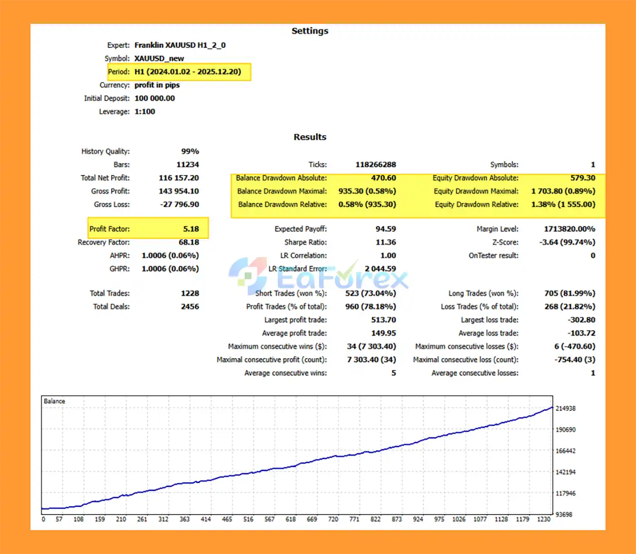 Unlike many EAs based on outdated historical data, Franklin is optimized for current market conditions, reflecting today’s gold volatility and price structure rather than legacy patterns.