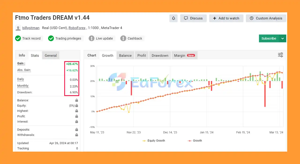 Yes. Verified Myfxbook results show a growth rate of +25.47%, average monthly profit of 2.23%, and maximum drawdown of 6.90%, confirming reliable performance for Prop Firm challenge preparation.
