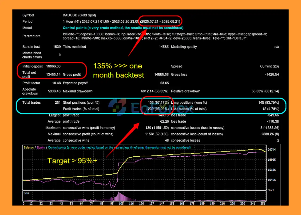Backtests on XAUUSD show 95.22% win rate with a total net profit of $13,466.14 from a $10,000 deposit, demonstrating high-confidence trade execution over the test period.