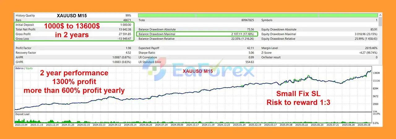 Based on 2-year backtest results on XAUUSD with an initial deposit of $1,000, Gann Gold EA MT5 achieved a total net profit of $13,642.38 with a maximum drawdown of 17.18%, demonstrating strong profitability with controlled risk.
