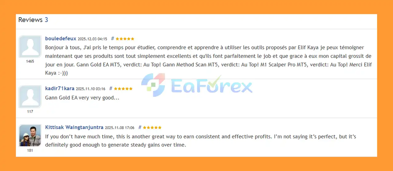 🔺Gann Gold EA is highly appreciated by the MQL5 community for bringing stable and reliable profits. Below are 5 star reviews from users: