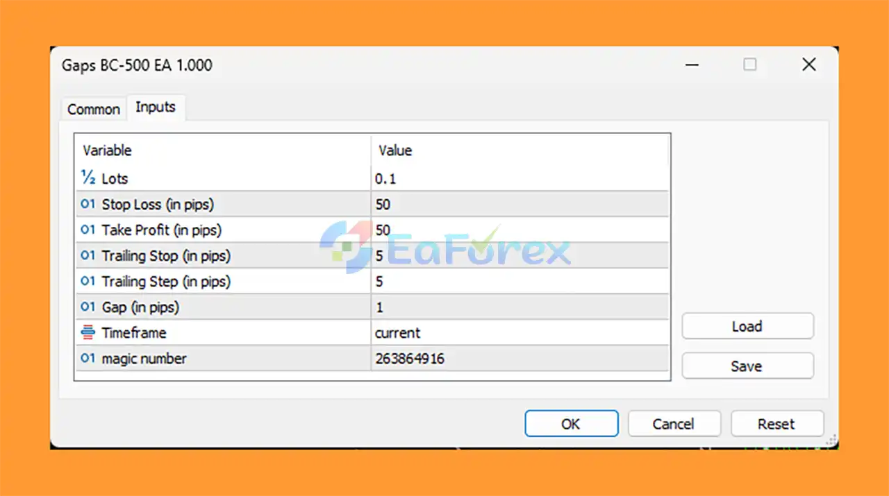 • Drag and drop Gaps BC-500 EA from the Navigator → Expert Advisors list onto the chart.