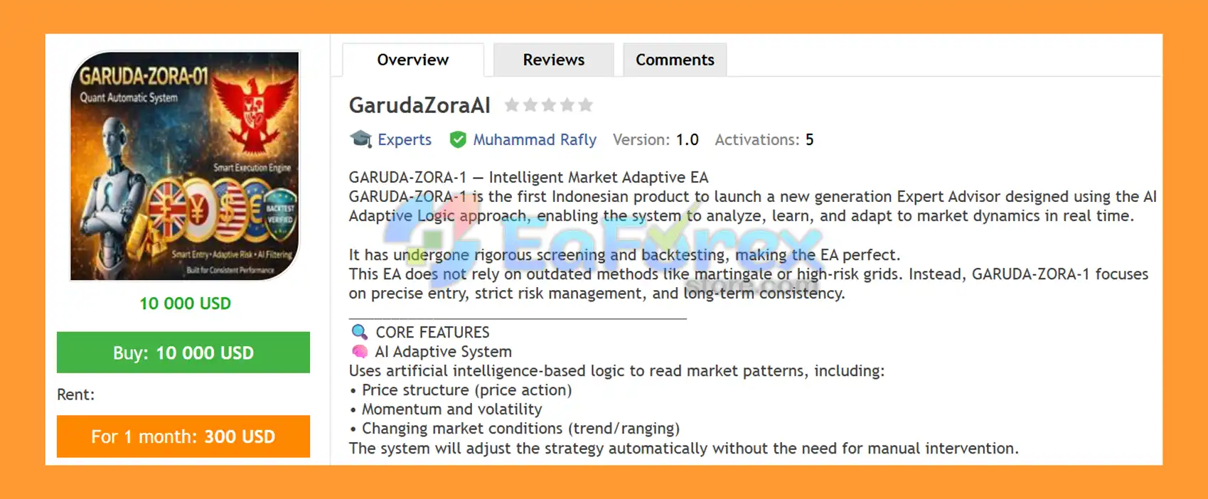 GarudaZoraAI EA MT4 is an AI-adaptive automated trading system for MetaTrader 4 that analyzes market structure, volatility, and momentum in real time to generate high-quality trade entries with disciplined risk control.