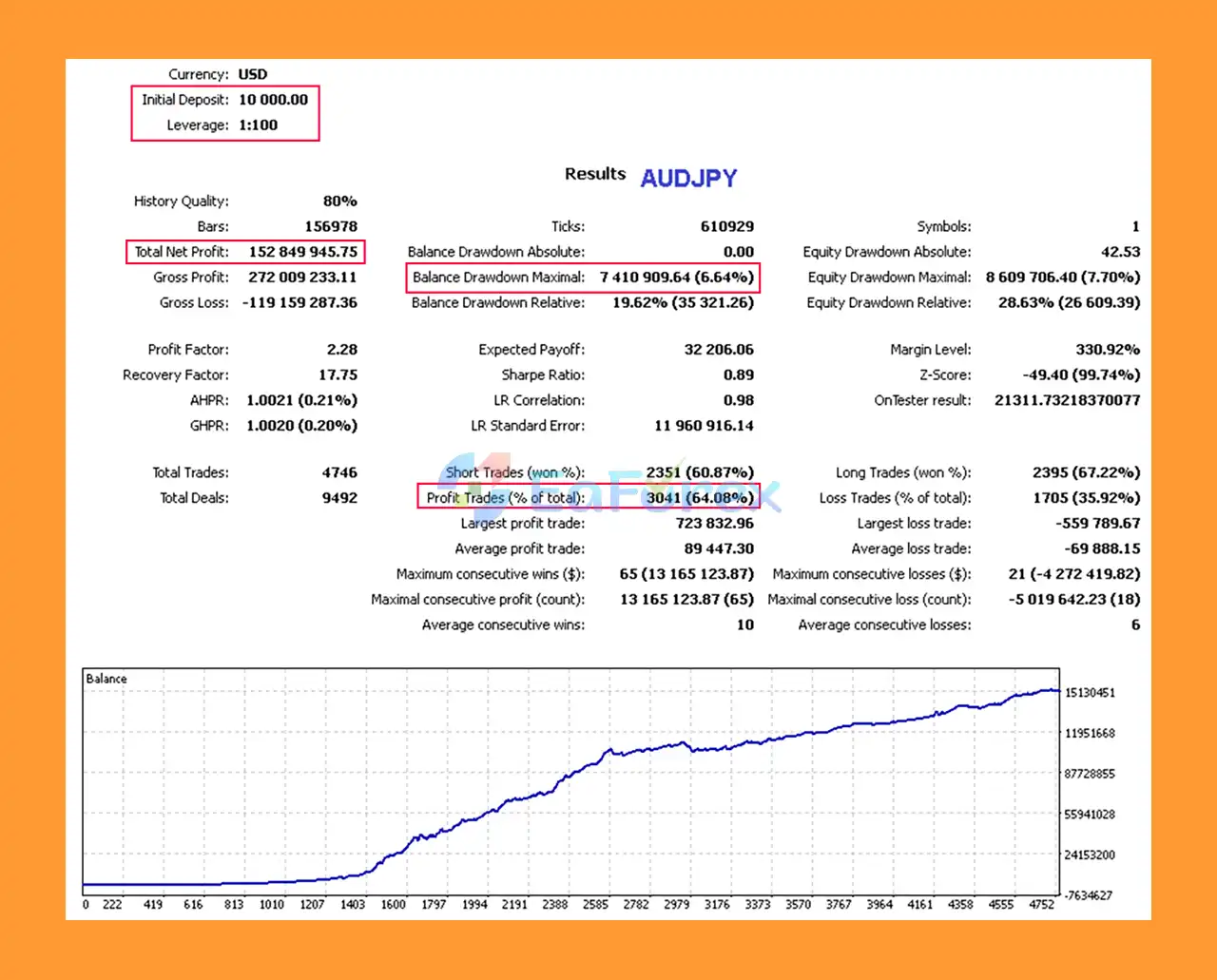 AUDJPY: $10,000 → $152.849M, Win Rate 64.08%, Max Drawdown 6.64%