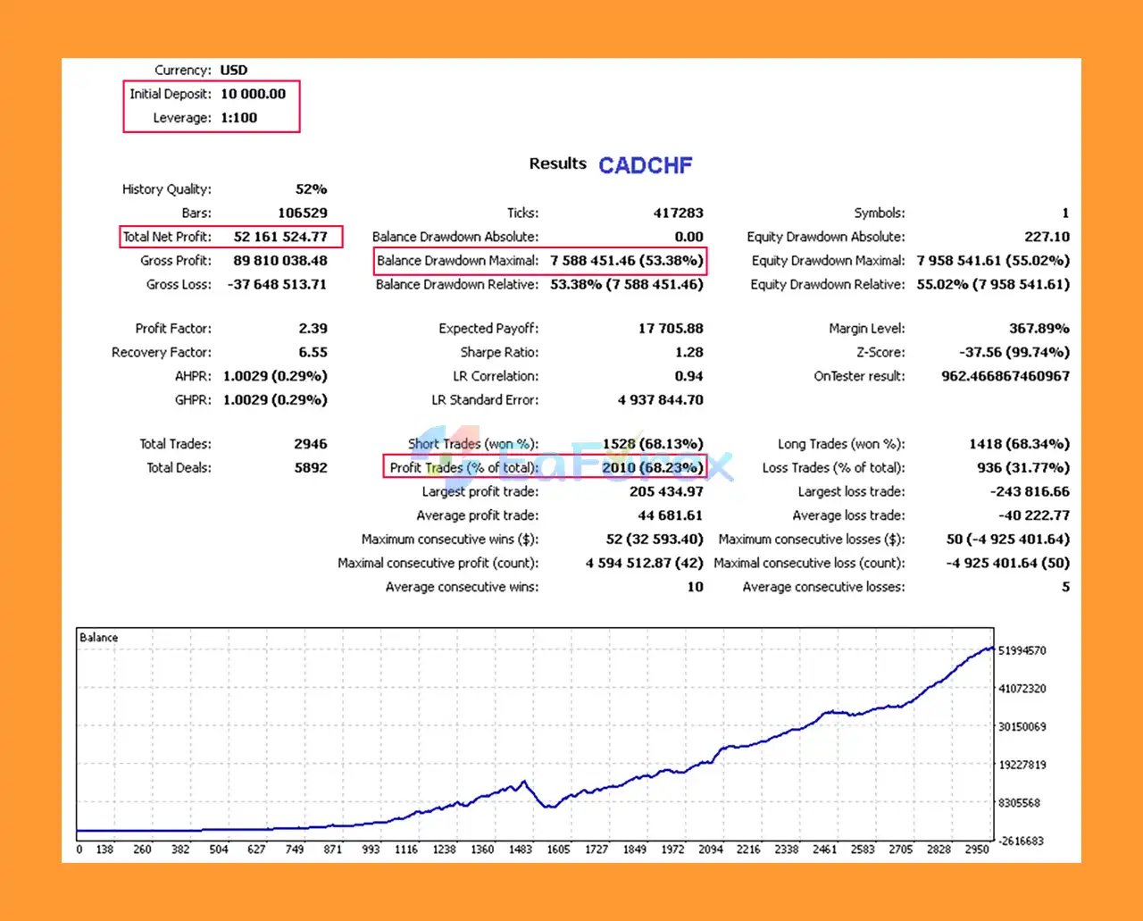 CADCHF: $10,000 → $52.161M, Win Rate 68.23%, Max Drawdown 53.38%