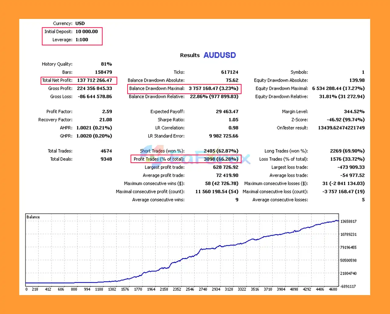 AUDUSD: $10,000 → $137.712M, Win Rate 66.28%, Max Drawdown 3.23%