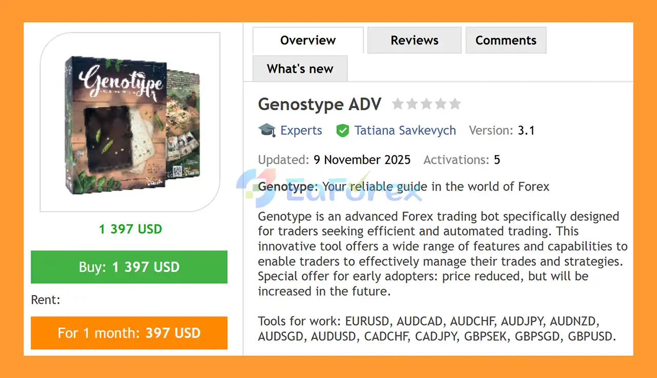 In summary, In summary, Genostype ADV EA MT4 is a powerful and intelligent Forex trading robot designed to automate strategies and enhance trading efficiency. Developed by Tatiana Savkevych, this EA supports multi-currency trading with advanced risk management, real-time market analysis, and profit protection tools. Its customizable settings, trailing stop, spread filters, and volatility adaptation make it suitable for both beginner and experienced traders. Backtested with impressive results, Genostype ADV EA MT4 ensures reliable performance, capital protection, and time-saving automation, making it an essential tool for traders seeking consistent, smart, and profitable Forex trading.