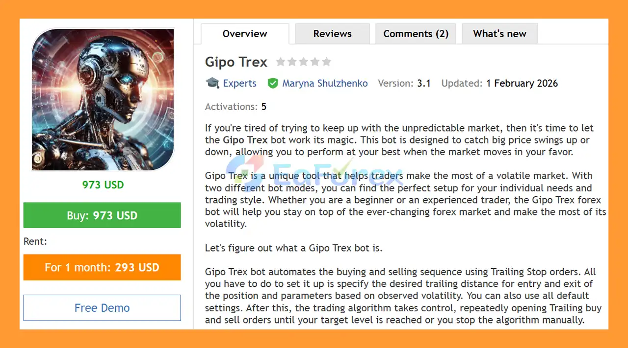 Gipo Trex EA MT4 is a fully automated Forex trading robot developed for the MetaTrader 4 platform. It is designed to capture strong bullish and bearish price movements in volatile market conditions using a dynamic trailing stop strategy.