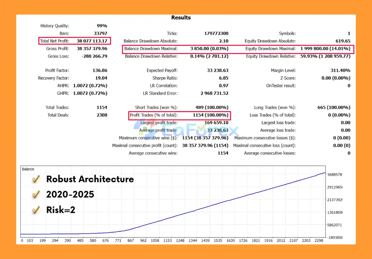 Live trading on gold shows 100% win rate with 17% growth in 3 weeks. Backtests (2020–2025) show growth from $1,000 to over $45M depending on risk level, with max drawdowns below 0.05% and consistent 100% win rate.