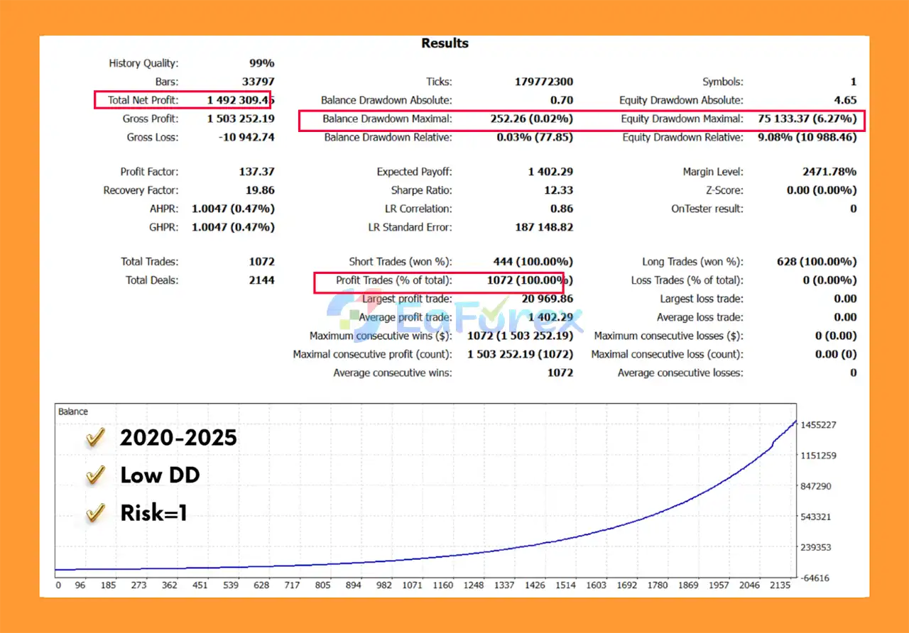 RISK = 1 Strategy: $1,000 → $1.49M, Win Rate 100%, Maximum Drawdown 0.02%