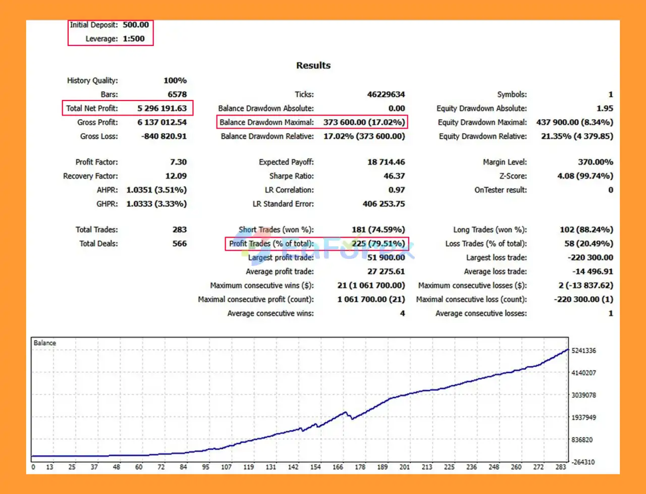 Backtests show a total net profit of $5.296 million on a $500 deposit, with a 79.51% win rate and a maximum drawdown of 17.02%, demonstrating disciplined trend-following performance.