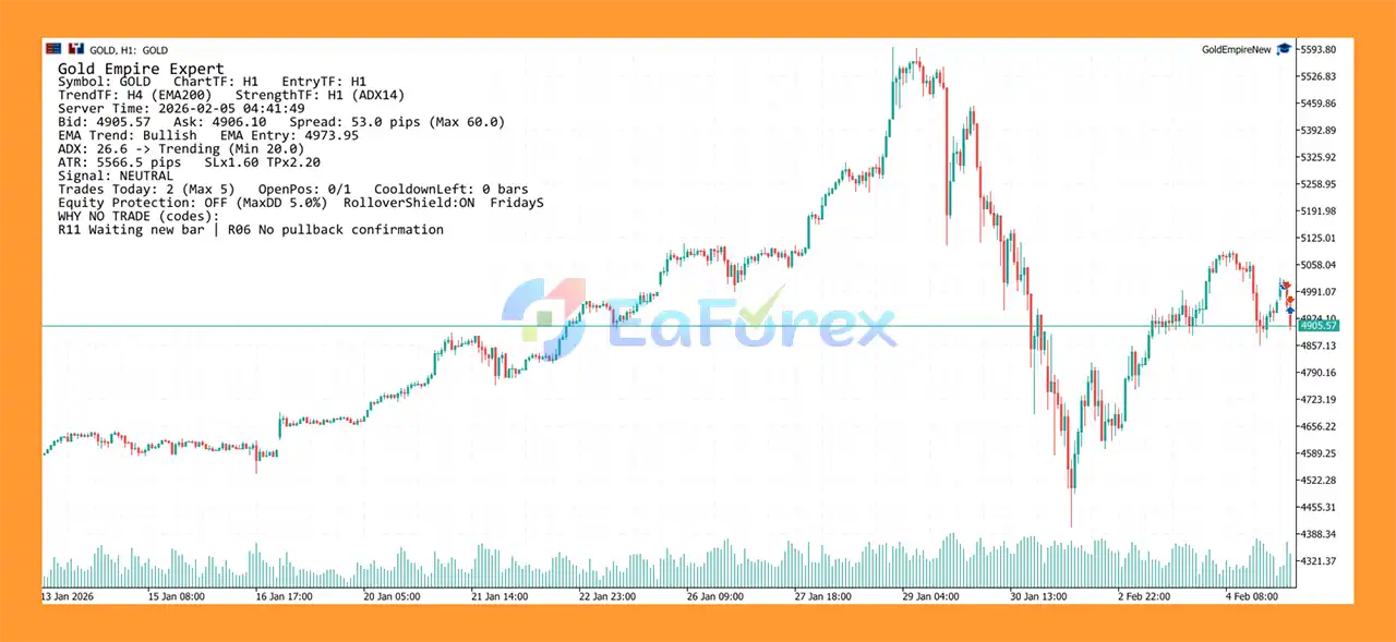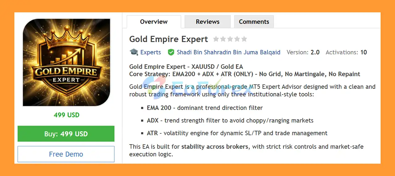 Gold Empire Expert EA MT5 is a trend-following EA for XAUUSD using EMA200, ADX and ATR, offering safe trading, strict risk control and no grid or martingale.