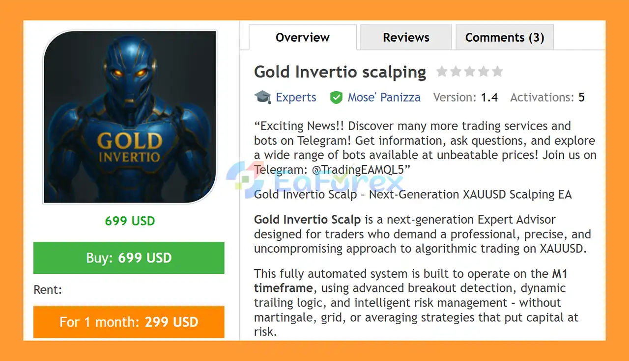 • Notable Products: Gold Invertio scalping EA MT4, Xauusd Eutopya Fast, Bicoin Et Futurum and other advisors.