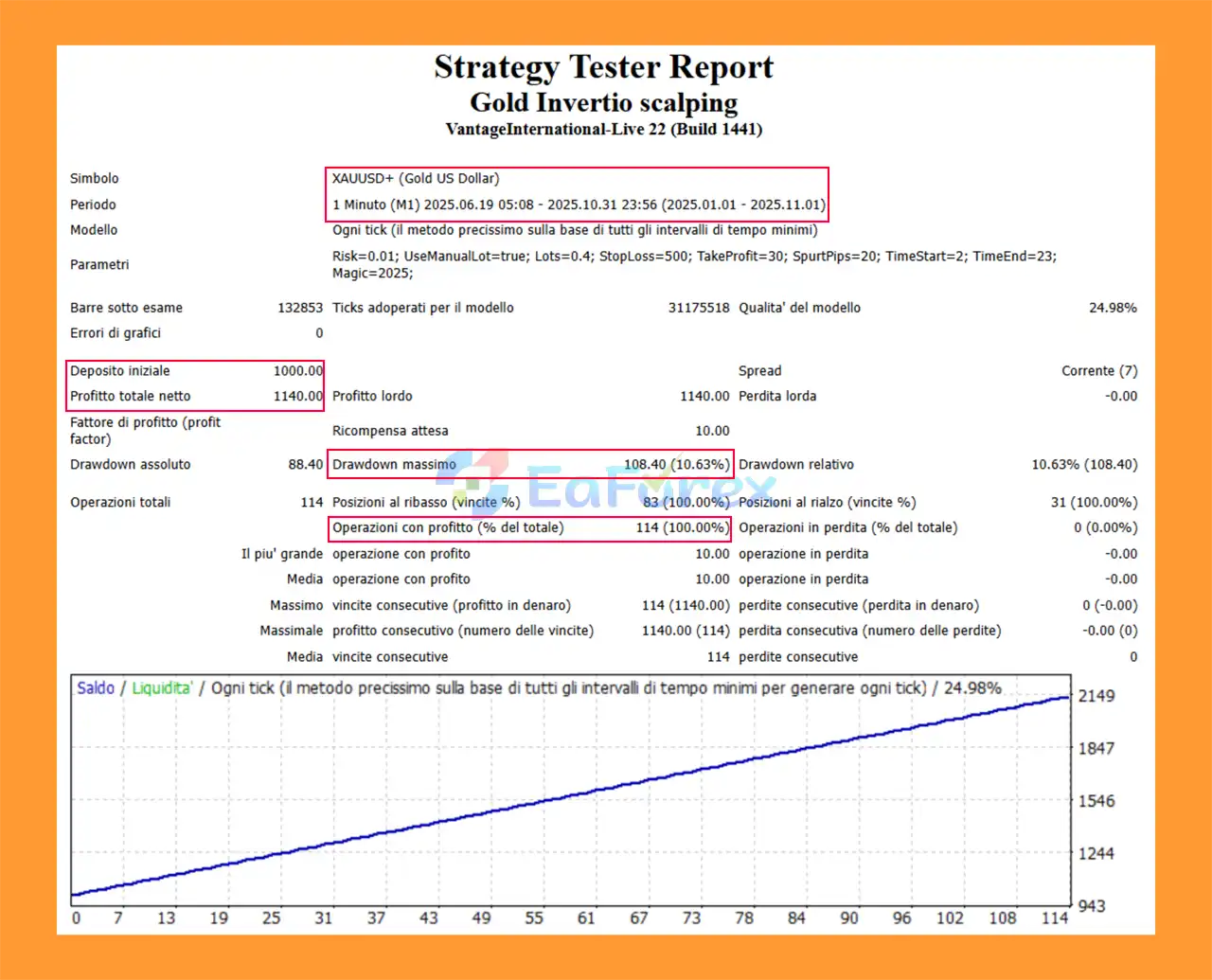 Backtests on XAUUSD for 11 months show a 100% win rate, net profit of $1,140 on a $1,000 deposit, and a maximum drawdown of 10.63%, demonstrating reliable and consistent results.
