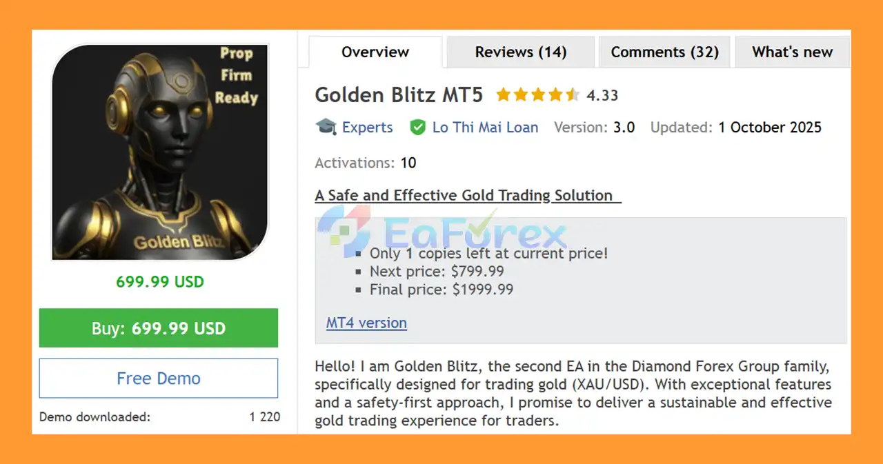 • Notable Products: Gold ISIS MT5, Bitcoin Scalping MT5, US30 Scalper EA MT5, Nasdaq100 Algo Trading MT4, EA Diamond Infinity MT4 and other advisors.