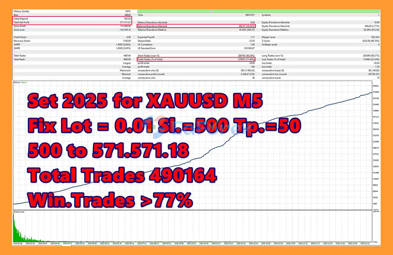 Backtests for XAUUSD in 2025 show an initial $500 deposit growing to $571,571.81 with a win rate of 77.46% and a maximum drawdown of 18.24%. While past results do not guarantee future performance, these numbers indicate strong potential for consistent profits.