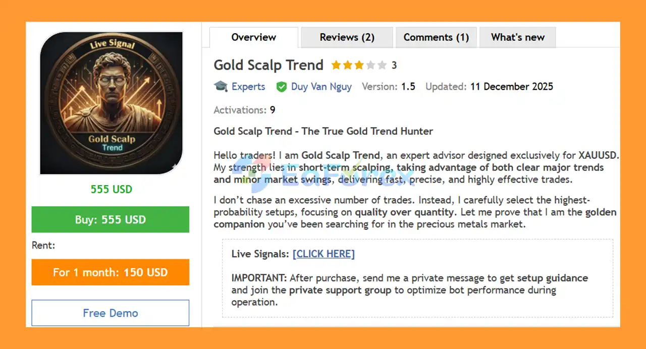 Gold Scalp Trend EA MT5 is ideal for gold-focused traders seeking hands-free, trend-based scalping, prioritizing trade quality, capital protection, and consistent execution over aggressive or risky strategies.