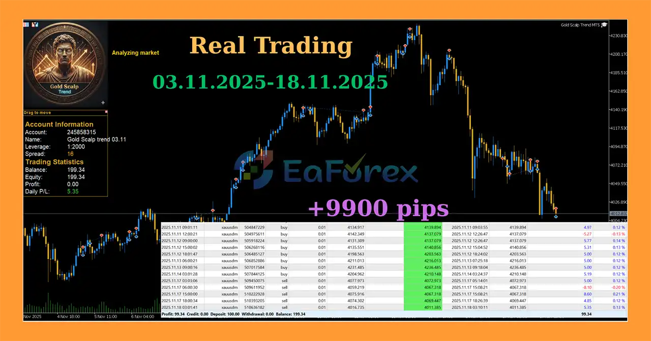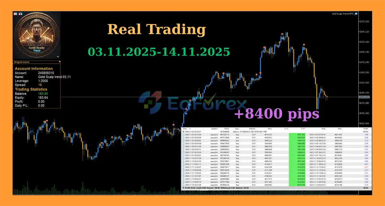 Gold Scalp Trend EA MT5 is an XAUUSD trading EA that uses trend-based logic and strict risk management. Profits have been verified on a real account.