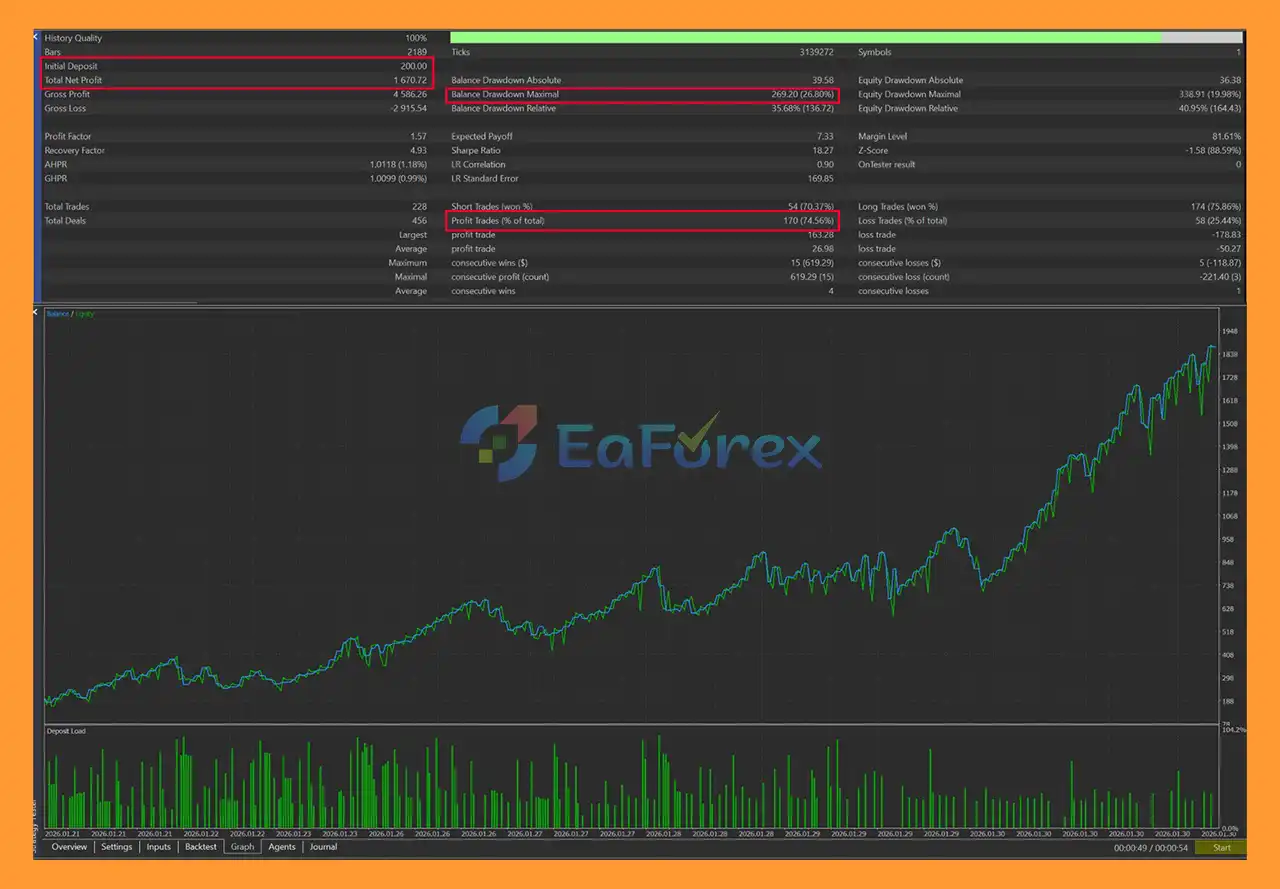 In historical backtests with a $200 initial deposit, Gold Trader Scalper EA MT5 achieved a net profit of $1,670.72, a win rate of 74.56%, and a maximum drawdown of 26.80%, reflecting its high-activity scalping nature