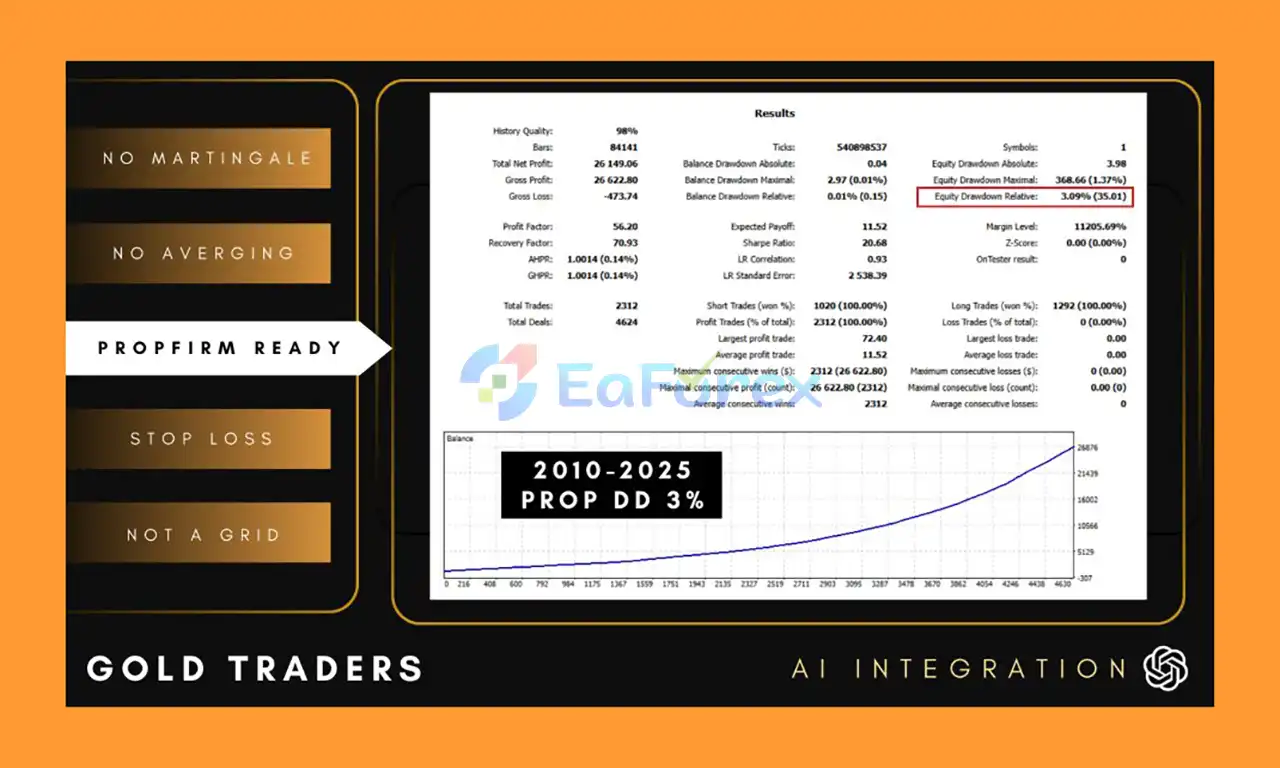 Using multilayer perceptron (MLP) neural networks, the EA detects patterns in gold price movements, applies volatility-based position sizing, and avoids high-risk methods such as martingale, grid, hedging, or scalping. With over 20 years of tick data integrated for training, it ensures robust performance, resilience to market shocks, and prop firm compatibility.