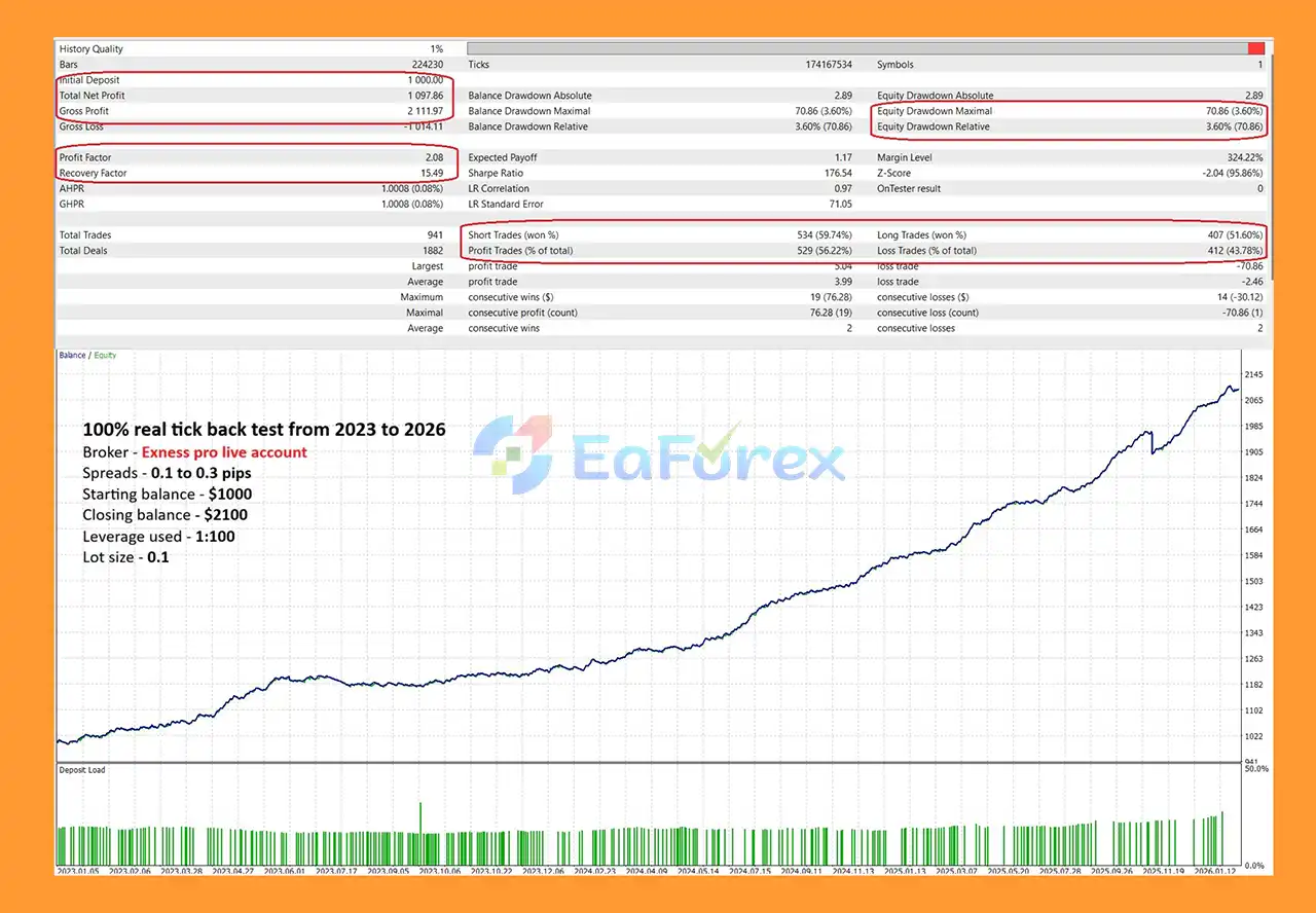 Backtests show a 56.22% win rate on XAUUSD over 3 years, with a total net profit of $1,097.86 from a $1,000 deposit and a maximum drawdown of 3.60%.