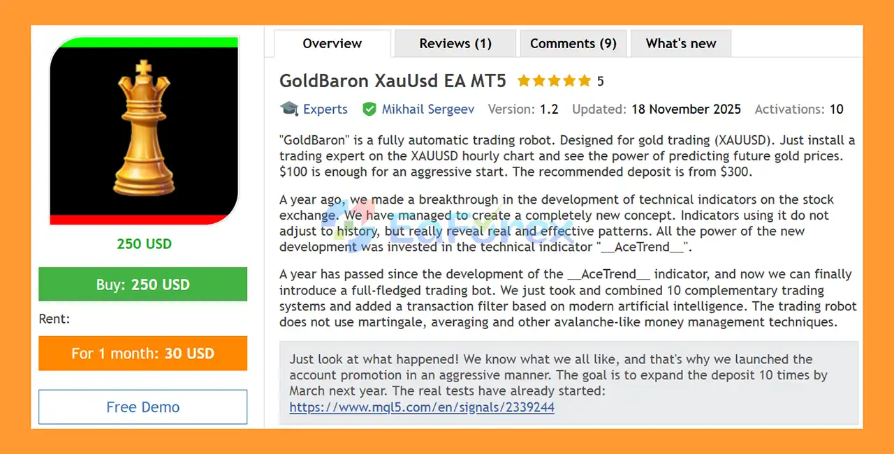 • Notable Products: GoldBaron XauUsd EA MT5, Ilanis MT5, Ilanis MT4, UniversalMA EA and other advisors.