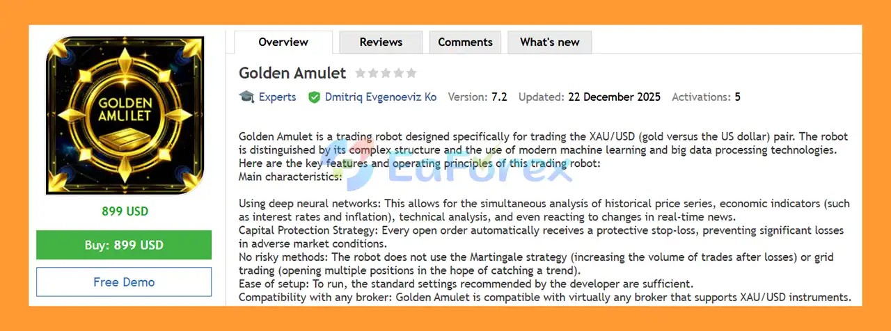 In summary, Golden Amulet EA MT5 is a next-generation, AI-powered automated trading solution designed exclusively for XAU/USD traders who value intelligence, stability, and long-term capital protection. By leveraging deep neural networks, machine learning, and big data analysis, this EA goes far beyond traditional indicator-based systems, delivering highly accurate and adaptive trading decisions in the volatile Gold market. Its strict risk management framework—featuring mandatory stop-loss protection, no grid, and no martingale logic—helps maintain exceptionally low drawdown while targeting consistent performance. Backed by impressive backtest results and developed by an experienced MQL5 author, Golden Amulet EA MT5 stands out as a professional-grade, future-ready Gold trading Expert Advisor for traders seeking reliable,