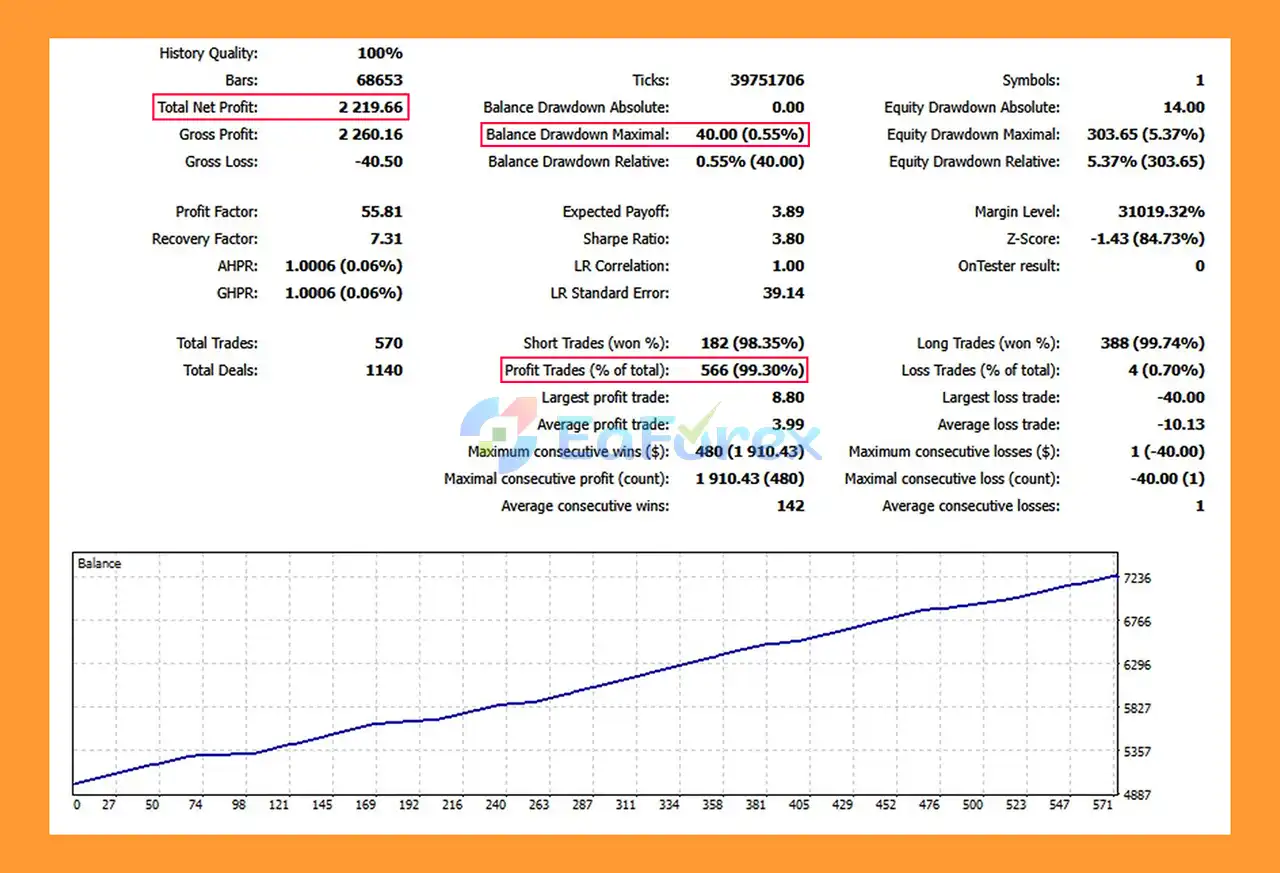 Yes. The EA has been backtested on XAU/USD with an initial deposit of $1,000, achieving a 99.30% win rate, very low drawdown (0.55%), and strong net profit performance focused on stability.