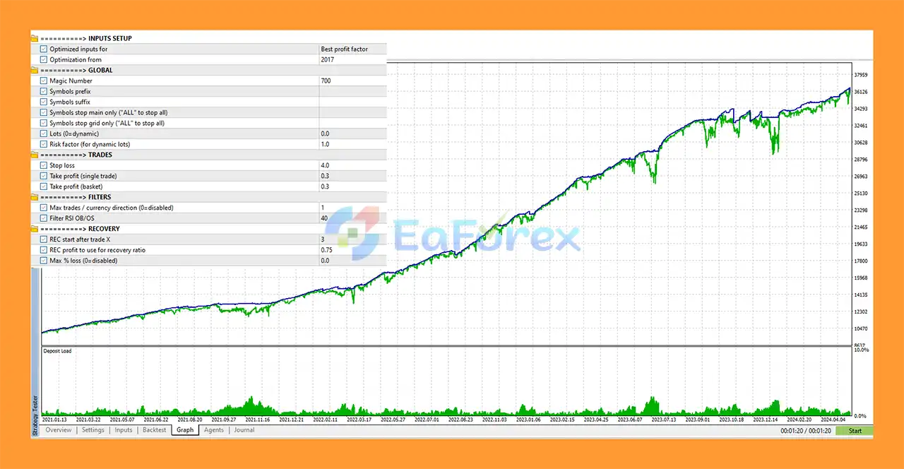 In conclusion, Golden Goal GG EA MT5 is a highly reliable and fully automated Forex Expert Advisor, designed to trade all 28 major and minor currency pairs using a mean-reversion strategy. Leveraging historical optimizations from 2017–2020, this EA allows traders to select pre-tested rule sets for either lowest drawdown or highest profit factor, ensuring consistent performance in varying market conditions.